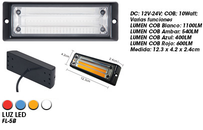 Varias funciones 12V-24V, 10W Tencolog?a COB LED Disponible en ?mbar: 540LM Claro: 1100LM Azul: 400LM Rojo: 600LM Medidas: 12.3cm x 4.2cm x 2.4cm